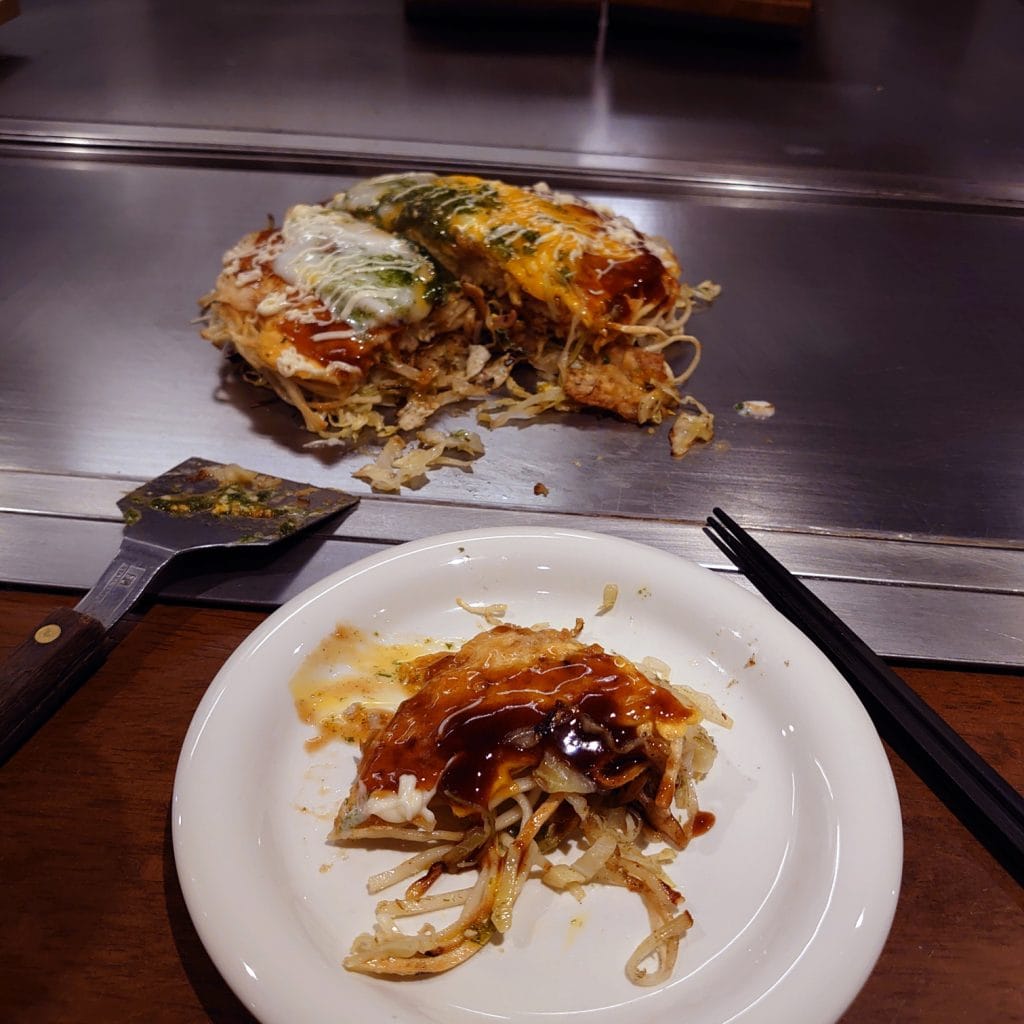 昼にお好み焼きと生。最高ですw。そう生まれ故郷は関西圏文化も半分以上入っているので、子供の頃の土曜の昼食は吉本新喜劇をTVでみながら、やきそばやお好み焼き(故郷ではどんどん焼き)と言うソース味の炭水化物に白飯と言うWパンチが多かった。